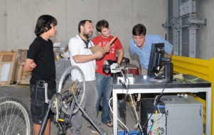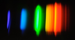 Top: Spectrum of a compact-fluorescent lightbulb measured with a home-made spectrometer consisting of a $5 webcam, fragment of CD, tin foil slit, in a toilet paper tube. Physics 105, 107, and 208 students each make their own visual spectroscopes to explore light sources in the environment. Middle: Perspective distortion with a fish-eye lens, explored in Physics 208. Rapid attenuation of electric fields with distance creates a somewhat analogous distortion in how weakly electric fish perceive objects with their electric sense. Bottom: Exploring the physics of a bike-powered pearl millet thresher with a high speed video camera (Physics 106). Results are here.