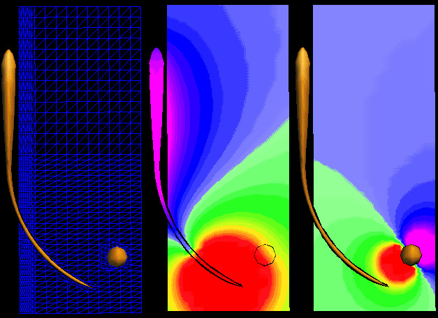 The left frame shows the 3-d fish body and object, as well as the points in the midplane at which the electric potential was simulated. The potential solution was linearly interpolated over the triangles shown in the blue mesh. The middle frame depicts the head-negative peak of the EOD, with the rainbow color scale ranging from purple (<= -10 mV) to red (>=10 mV), and the lightest blue at 0 mV. The rightmost frame shows the difference that the object makes: when we subtract the field simulated without the object from the field with the object present, the object's effect can clearly be seen as an induced dipole field. (The potential difference has been magnified by a factor of 100 to make it visible on this color scale.)