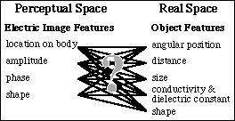 The proposed mappings between electric image and object feature spaces, summarized in Fig. 4, are only a first guess and working hypothesis of how weakly electric fish might process electrosensory information to perceive objects. The corresponding algorithms are capable of identifying the major features of small, isolated, stationary objects near a stationary fish. We have only begun to explore their robustness in the fish's more complex environment, where potentially confounding factors include multiple active and passive sources; large and heterogeneous, non isotropic objects; and EOD envelope modulations from relative motion of the fish and objects. Although some of these confounding factors can be isolated by simple temporal or spatial filtering, more substantial modifications of the algorithms may be necessary to resolve other ambiguities. Note that these simple algorithms ignore a vast amount of electrosensory information, for example, correlations within temporal sequences of electric images generated as the fish moves. Given the complex repertoire of behaviors electric fish use for exploration, it is evident that electrolocation involves additional algorithms to those presented here.