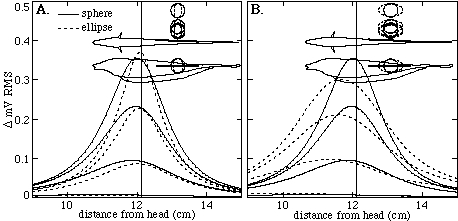 What if the object is not spherical? Figure 2 shows the simulated electric images of spheres and two orientations of ellipsoids with eccentricity of 2. The relative width of the images increases with object distance, however the rostrocaudally compressed ellipsoids have narrower images and the rostrocaudally expanded ellipsoids have wider images than corresponding spheres. Interpreting the first ellipsoid images (Fig. 2A) according to our algorithm for spheres results in the perception of a smaller and nearer sphere (because the image is narrower and has larger peak amplitude). Likewise, the second ellipsoid images (Fig. 2B) correspond to larger and more distant spheres. Although globally incorrect, these inferences are consistent with spheres whose proximal surfaces to the fish approximately correspond with the proximal surfaces of the actual ellipsoids.