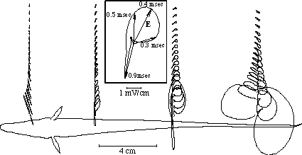 Figure 3. The electric field vector is shown here along four lateral lines in the midplane of Apteronotus leptorhynchus. The initial phase of the field vector is shown as a line from each measurement point (dots). At subsequent times, just the tip of each field vector is traced. At any phase, the field is represented by a vector from the measurement point to the curve (inset shows 4 example phases). The field vectors rotate counterclockwise in the caudal part of the body, whereas rostral of the gill, only the magnitudes and sign, but not the direction, changes during the EOD cycle.