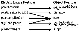 Electric images of small objects are broad 1-3 phase "bumps" in the transdermal potential across the body and contain only low spatial frequencies (Rasnow 1996; Bacher 1983; Heiligenberg 1975). As such, they can be described by just a few parameters. The location of the main image peak approximately coincides with the latitude and longitude of the object, and thus unambiguously reveals two of the object's 3- dimensional coordinates. Determining object distance from an electric image is not as simple because it not related to single image parameters listed in Fig. 1. For example, the magnitudes of electric images are strongly dependent on object distance because of the rapid attenuation of the fish's electric field with distance from its body. But image magnitude also depends on other parameters such as object size, shape, and impedance. The first hint of a simple solution to disentangle these variables came from analyzing electric images of conducting spheres. We found that the relative width of the image peak (i.e., a parameter like the standard deviation of a Gaussian function) depends solely, and linearly, on the distance from the skin to the sphere's center. Object size can now unambiguously be solved for using the distance and peak amplitude of the image, which is proportional to the sphere's volume. What if the sphere is not a conductor? A sphere of radius a perturbs the potential at position r from its center by (Rasnow 1996):