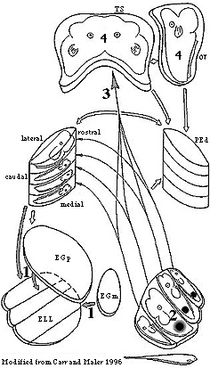 Figure 5. On this figure of electrosensory pathways in the Gymnotiform fish, we have labeled regions where the proposed computations for high frequency electrolocation might be implemented. 1. Extraction of the object image, by subtracting expectation conveyed through descending feedback to ELL. 2. Convolution of the electric image with center- surround receptive fields and thresholding activates a region of ELL proportional to the image's relative width. 3. Integrating over the ELL surface, in the convergent projections to the torus semicircularis (TS), measures the image size, which is proportional to object's distance. 4. Object size, shape, and higher order features could be computed in the torus, optic tectum (OT), and higher areas.